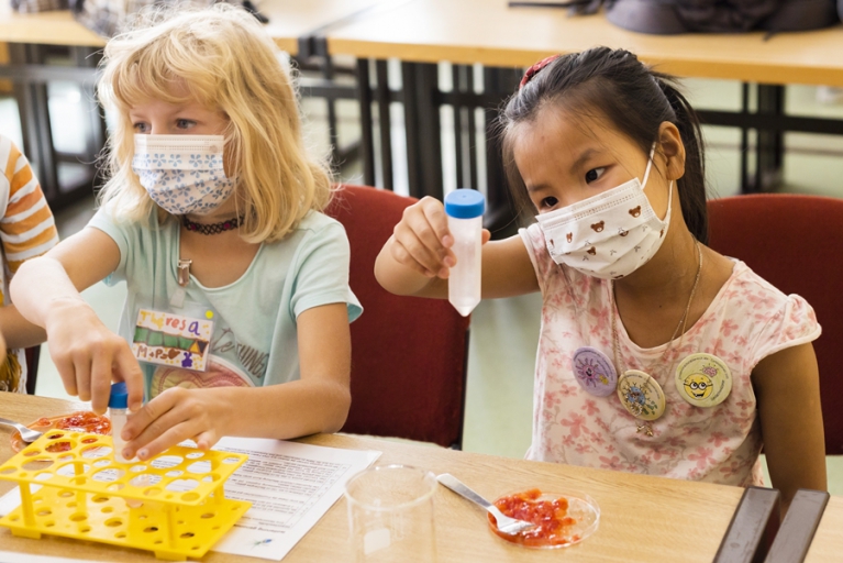 After an involuntary break in 2020 we could again welcome little scientists on the 29th of July and 5th of August. Within the framework of the campus holidays for kids of the family office of the OVGU they visited us, to discover the world of immune cells. PhD students of the MGK 854, students of the M.Sc. Immunology and staff members of CRC 854 gave them insights into the immune system. During an interactive lecture the children learned what this mysterious immune system actually is and how our body police protects us from intruders. Numerous questions and enthusiastic participation showed that the children had already heard many of the key words due to the pandemic but making sense of them is actually not so easy. Afterwards the litte discoverers could get gloves on and isolate DNA from strawberries - every succesful isolation was excitedly greeted. Furthermore the children could make immune cell buttons and take them home afterwards and everyone got a copy of "Immun im Cartoon", a comic for further reading at home. Thank you very much to the dsai e.V. (Patientenorganisation for angeborene Immundefekte) for providing these free of charge!