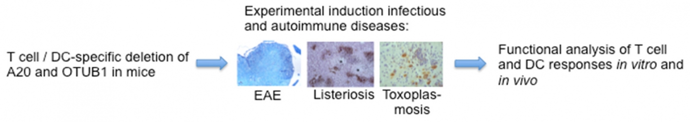A 05 defined that the deubiquitinating enzyme (DUB) CYLD aggravates listeriosis by inhibiting protective signaling pathways, whereas the DUB A20 ameliorates listeriosis by enabling the survival of CD8+ memory T cells. Employing a newly established conditional OTUB1-/- mouse strain, A 05 identified that the DUB OTUB1 regulates JAK-, TLR11- and YB-1-mediated signaling. In the next funding period, A 05 will focus on OTUB1 in (1) T cells, (2) DCs, (3) macrophages and (4) hepatocytes in listeriosis to determine the cell type-specific molecular function and plasticity of OTUB1 under inflammatory conditions.